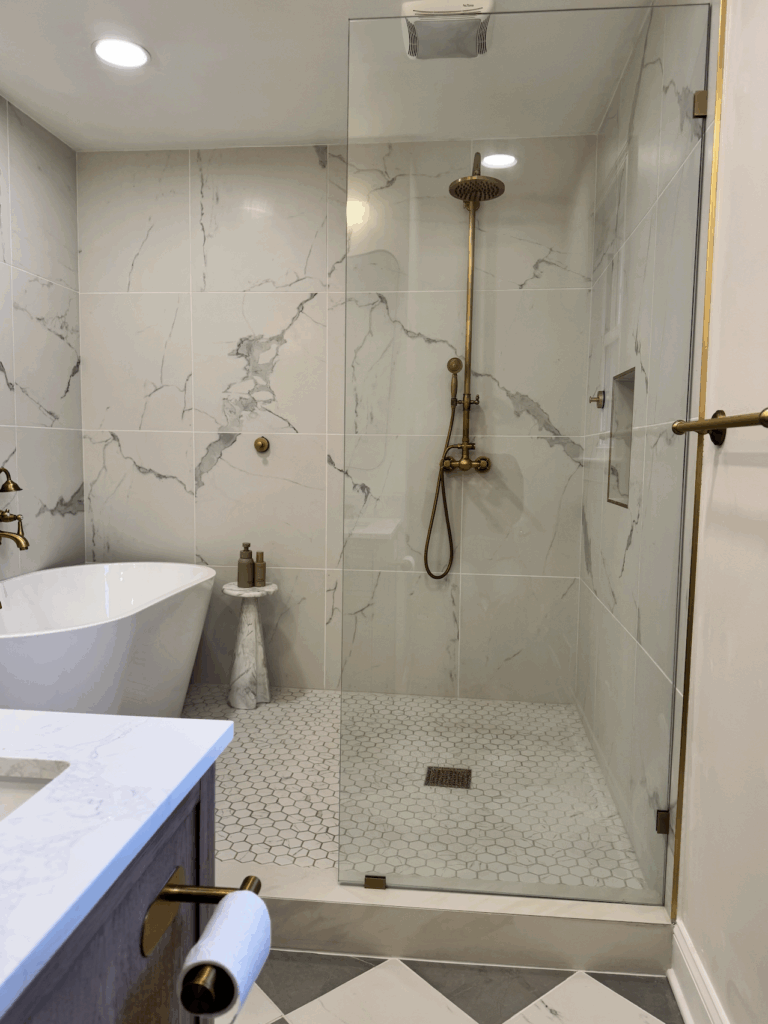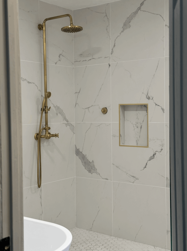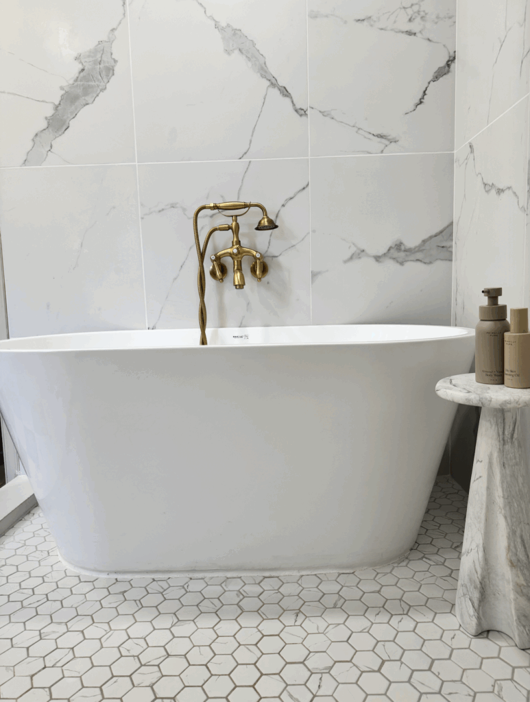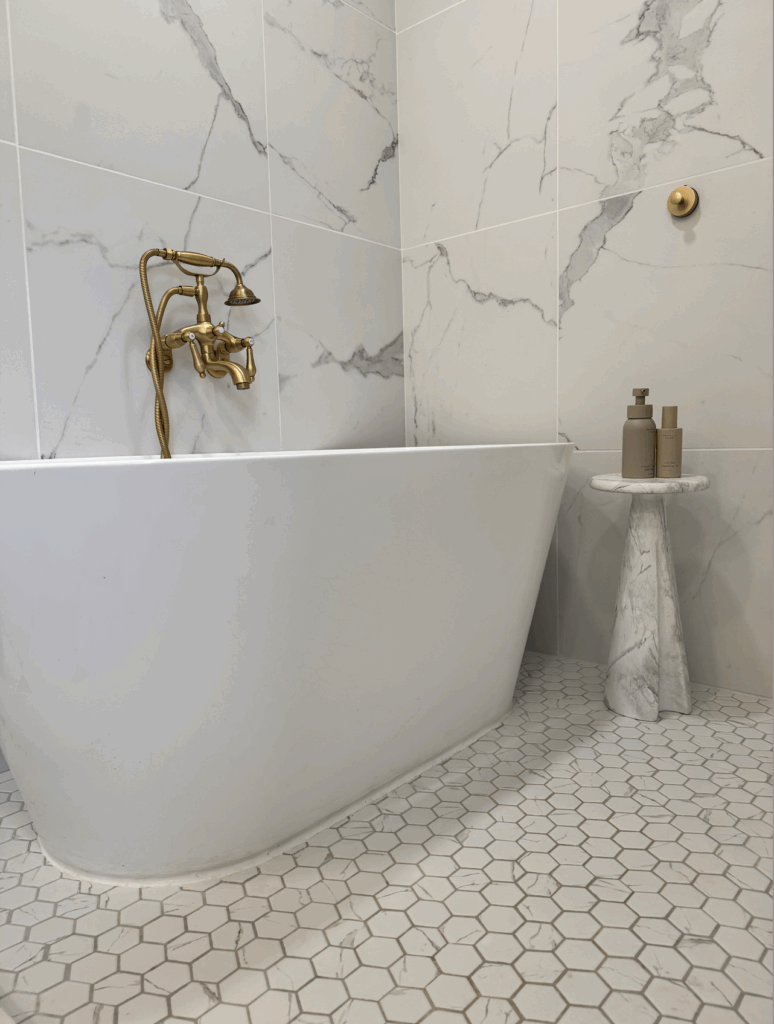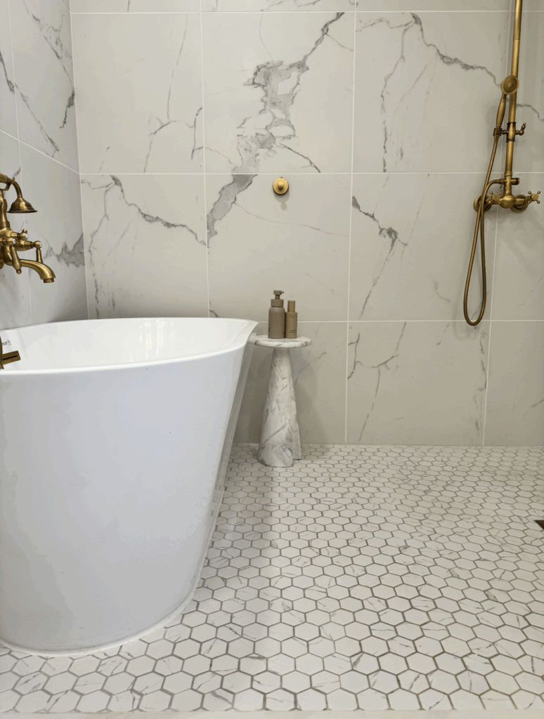 For the shower floor, I got the 12×12 tiles in calacatta and amani grey. I used the larger 24×24 tiles for the shower wall but only used the color calacatta. For the shower floor, we found a hexagon tile at Home Depot that looked almost identical in color to the calacatta tiles from Edward Martin. They look great paired together!