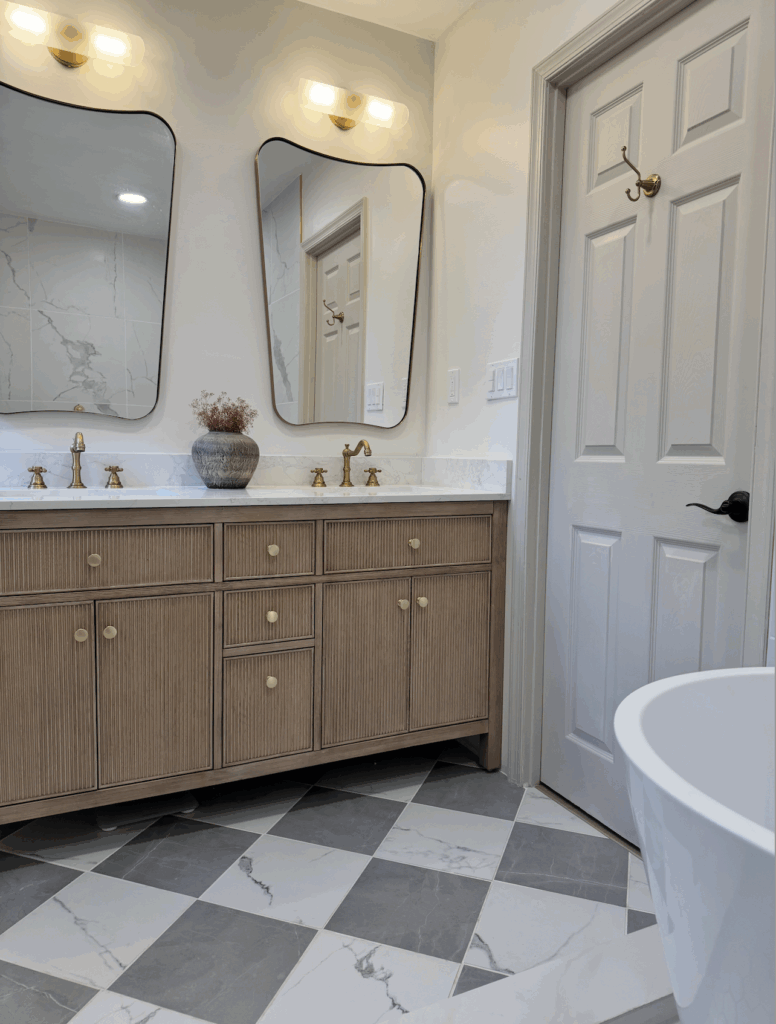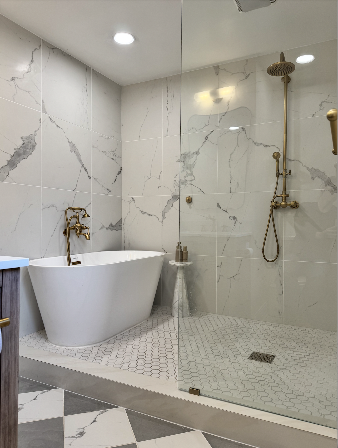 By completely redesigning the space we were able to get a larger shower, add a freestanding bathtub and get a larger double vanity. We went from a 48” double vanity to a 60” double vanity, which has made a world of difference.
