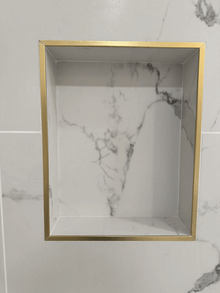 Jason built is this nook for our shampoo bottles. It’s so classy and beautiful.