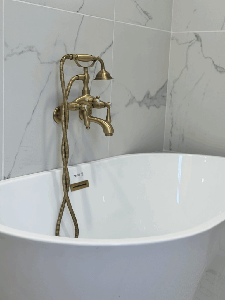 I ordered our bathtub from Wayfair. I got the size 54” x 29” in the color white/titanium gold. This was the absolute largest size tub we could fit in this space. It fits me but I think a taller person (over 5’7”) may feel a little crammed. If there’s one thing I wish we could change it would be the size of the tub to make it larger. Since this is the largest we could get, I am still happy! It makes for a nice soaking tub and the tub itself is so pretty.