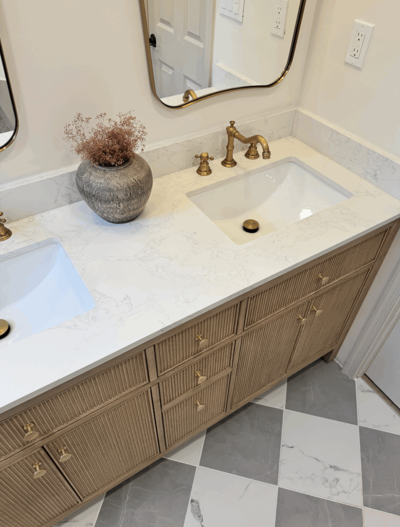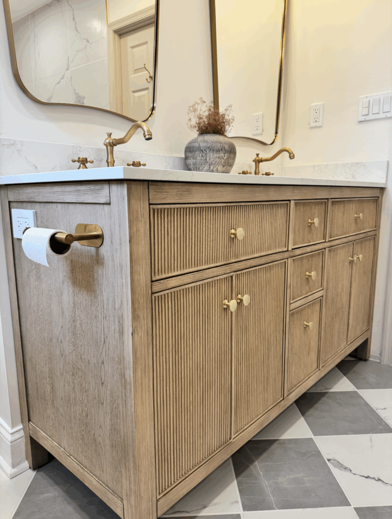 I chose this reeded wood vanity in natural oak that comes with an engineered stone top. It has soft close drawers and I’m thrilled with the color of the wood – it looks like white oak! It comes in several other size options and a darker brown oak version. It has ample storage and is well made. I highly recommend vanity if you’re looking for one.