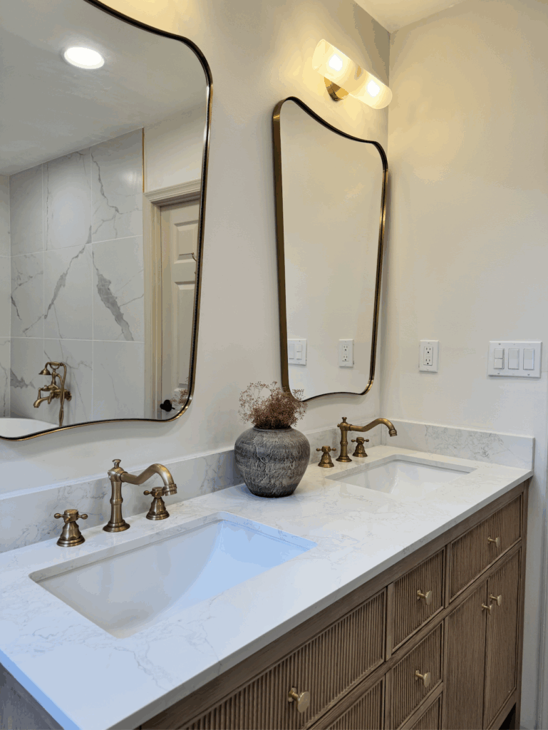 I wanted to give this bathroom a unique touch and I thought these irregular scalloped mirrors would do the trick. I got the 36”x24” in brushed gold. I think the extra large size really helps make the bathroom appear larger. I even had Jason move the vanity lights up to accommodate for the larger-size mirrors.